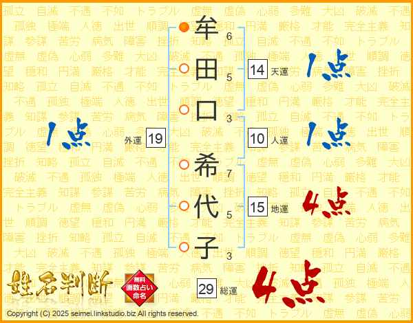 牟(6画)田(5画)口(3画) 希(7画)代(5画)子(3画)