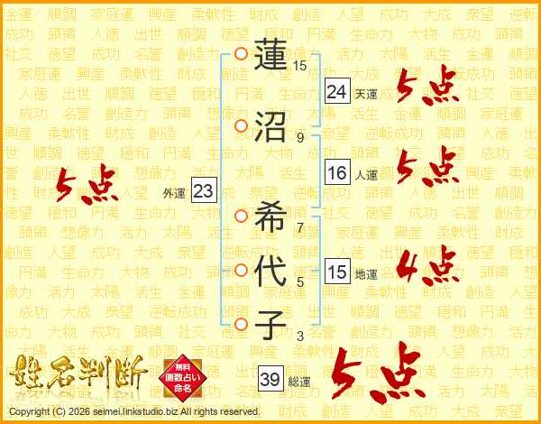 蓮(15画)沼(9画) 希(7画)代(5画)子(3画)