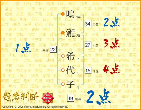 鳴(14画)瀧(20画) 希(7画)代(5画)子(3画)