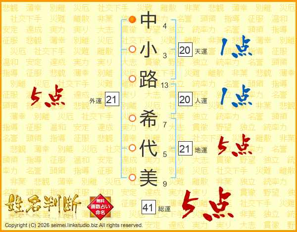 中(4画)小(3画)路(13画) 希(7画)代(5画)美(9画)