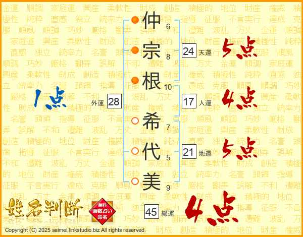 仲(6画)宗(8画)根(10画) 希(7画)代(5画)美(9画)