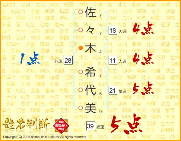 佐々木希代美さんの総運は39画の5点!