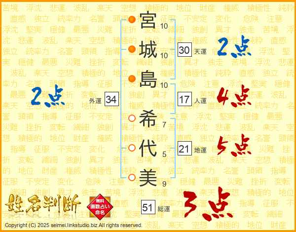 宮(10画)城(10画)島(10画) 希(7画)代(5画)美(9画)