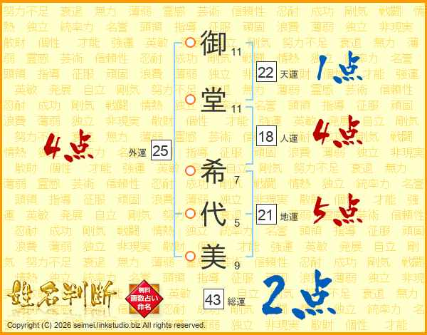 御(11画)堂(11画) 希(7画)代(5画)美(9画)