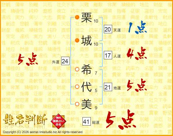 栗(10画)城(10画) 希(7画)代(5画)美(9画)