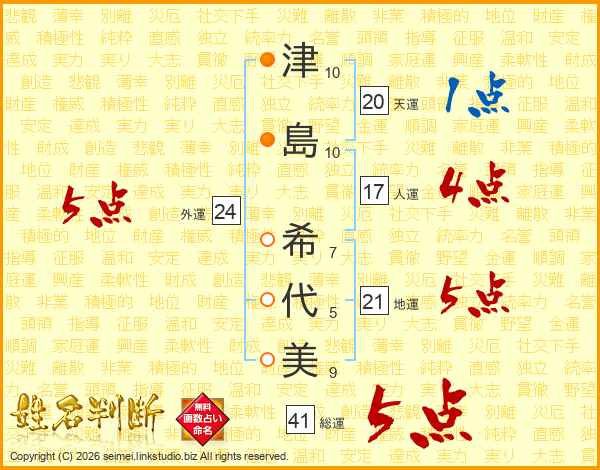 津(10画)島(10画) 希(7画)代(5画)美(9画)