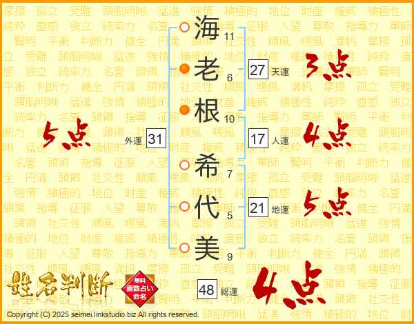 海(11画)老(6画)根(10画) 希(7画)代(5画)美(9画)