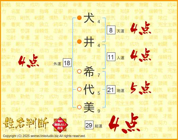 犬(4画)井(4画) 希(7画)代(5画)美(9画)
