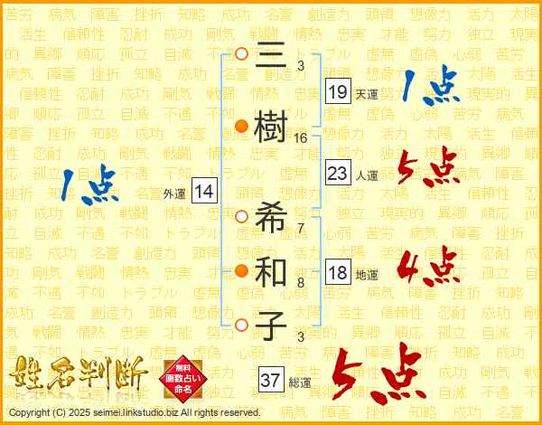 三(3画)樹(16画) 希(7画)和(8画)子(3画)