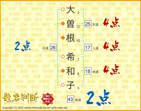 大(3画)曽(12画)根(10画) 希(7画)和(8画)子(3画)