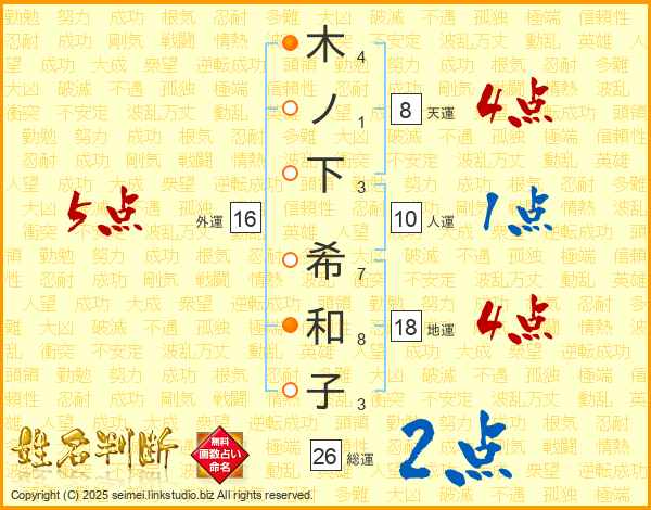 木ノ下希和子さんの総運は26画の2点!