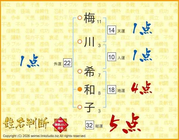 梅(11画)川(3画) 希(7画)和(8画)子(3画)