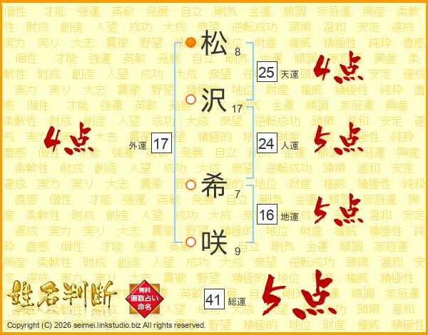 松(8画)沢(17画) 希(7画)咲(9画)
