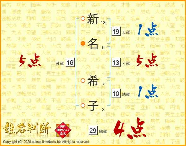新(13画)名(6画) 希(7画)子(3画)