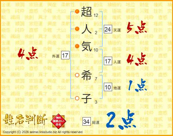 超人気希子さんの総運は34画の2点!
