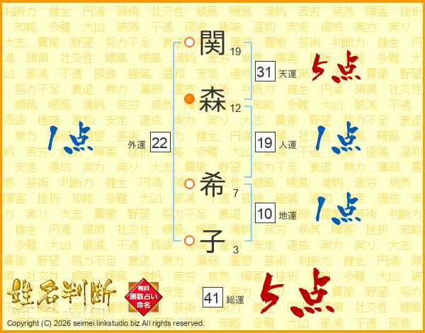 関(19画)森(12画) 希(7画)子(3画)