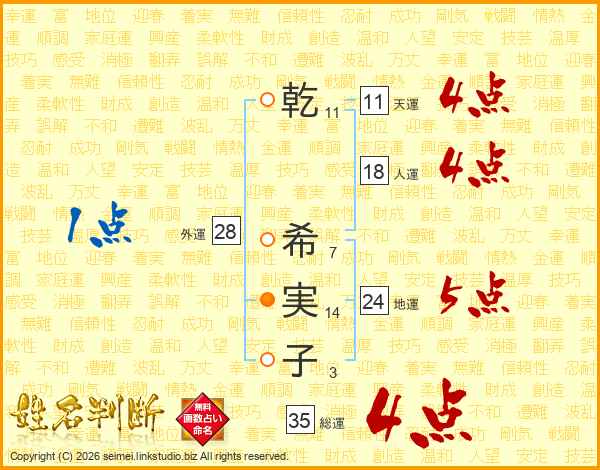 生活面を象徴する運勢です。外部から受ける影響力を表し、結婚運、家庭運や職場、環境への順応性を表します。総運から人運を引いた画数。姓や名が1文字の場合を除く。