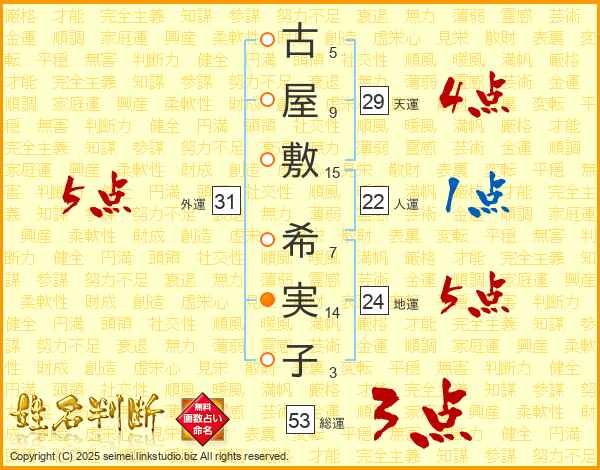 古(5画)屋(9画)敷(15画) 希(7画)実(14画)子(3画)