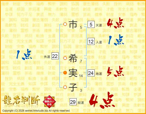 市(5画) 希(7画)実(14画)子(3画)