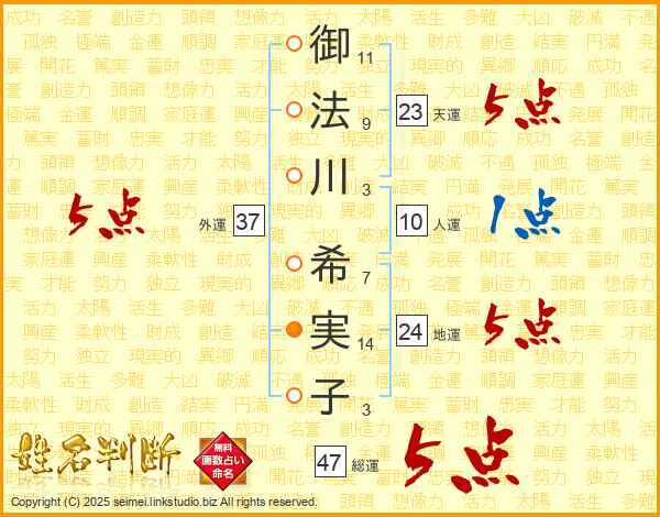 御(11画)法(9画)川(3画) 希(7画)実(14画)子(3画)