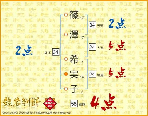 篠(17画)澤(17画) 希(7画)実(14画)子(3画)