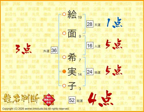 絵(19画)面(9画) 希(7画)実(14画)子(3画)