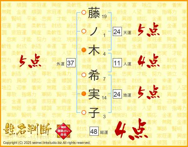 藤(19画)ノ(1画)木(4画) 希(7画)実(14画)子(3画)