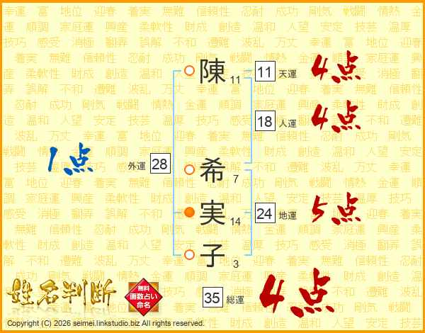 陳(11画) 希(7画)実(14画)子(3画)