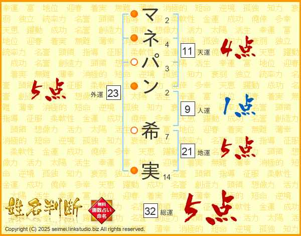 マ(2画)ネ(4画)パ(3画)ン(2画) 希(7画)実(14画)