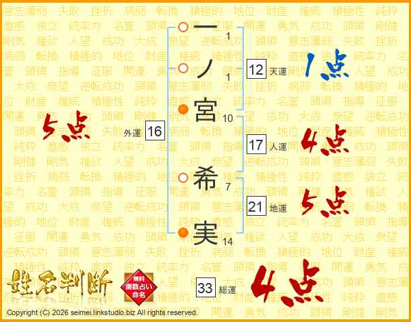 一(1画)ノ(1画)宮(10画) 希(7画)実(14画)