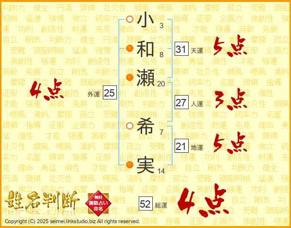小(3画)和(8画)瀬(20画) 希(7画)実(14画)