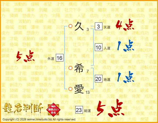 生活面を象徴する運勢です。外部から受ける影響力を表し、結婚運、家庭運や職場、環境への順応性を表します。総運から人運を引いた画数。姓や名が1文字の場合を除く。