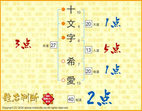 生活面を象徴する運勢です。外部から受ける影響力を表し、結婚運、家庭運や職場、環境への順応性を表します。総運から人運を引いた画数。姓や名が1文字の場合を除く。