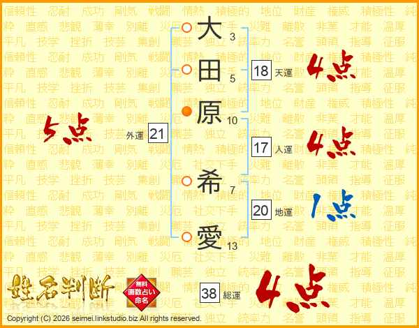 大(3画)田(5画)原(10画) 希(7画)愛(13画)