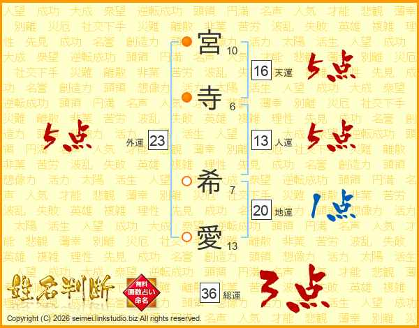 宮(10画)寺(6画) 希(7画)愛(13画)