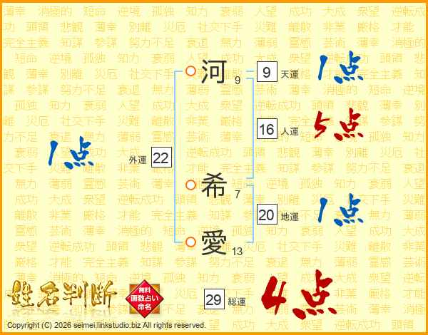 生活面を象徴する運勢です。外部から受ける影響力を表し、結婚運、家庭運や職場、環境への順応性を表します。総運から人運を引いた画数。姓や名が1文字の場合を除く。