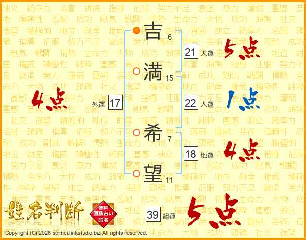 吉(6画)満(15画) 希(7画)望(11画)