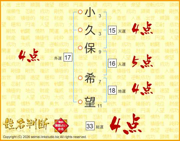 小(3画)久(3画)保(9画) 希(7画)望(11画)