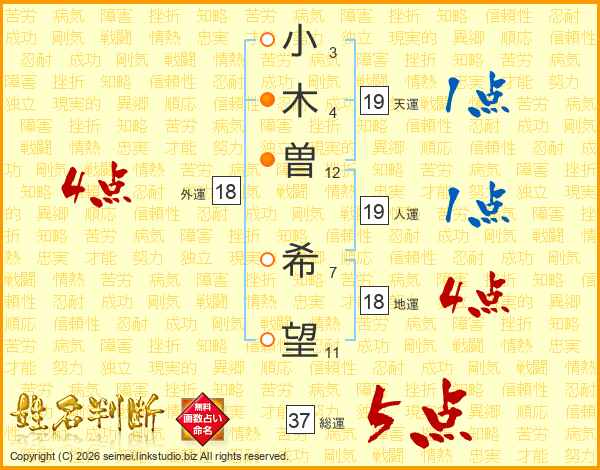 小(3画)木(4画)曽(12画) 希(7画)望(11画)