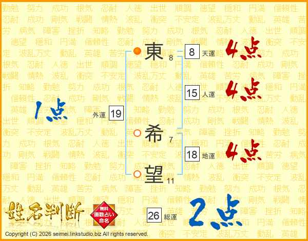 生活面を象徴する運勢です。外部から受ける影響力を表し、結婚運、家庭運や職場、環境への順応性を表します。総運から人運を引いた画数。姓や名が1文字の場合を除く。