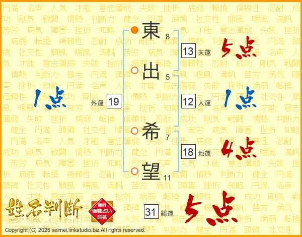東出希望さんの総運は31画の5点!