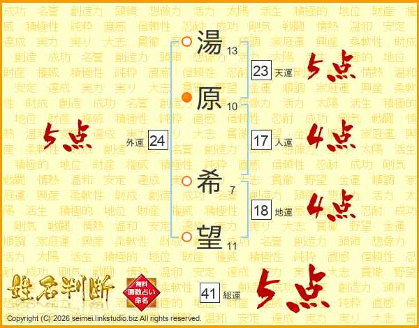 家系が持つ宿命的な運勢を表します。祖先から受け継いだ苗字ですので自分の力が及びません。家柄を象徴します。苗字の合計画数。
