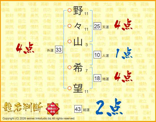 野(11画)々(11画)山(3画) 希(7画)望(11画)