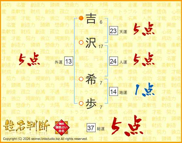 吉(6画)沢(17画) 希(7画)歩(7画)