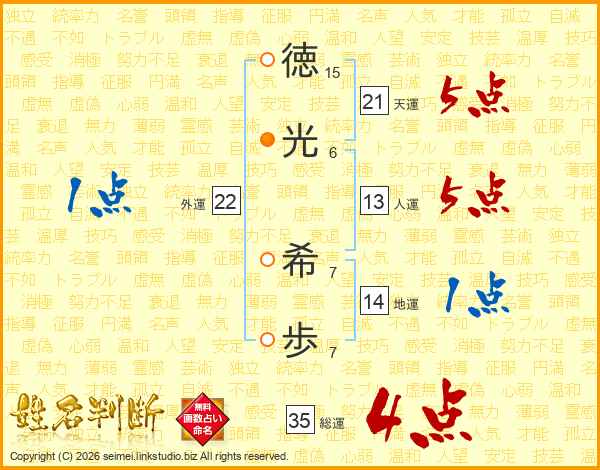 生活面を象徴する運勢です。外部から受ける影響力を表し、結婚運、家庭運や職場、環境への順応性を表します。総運から人運を引いた画数。姓や名が1文字の場合を除く。