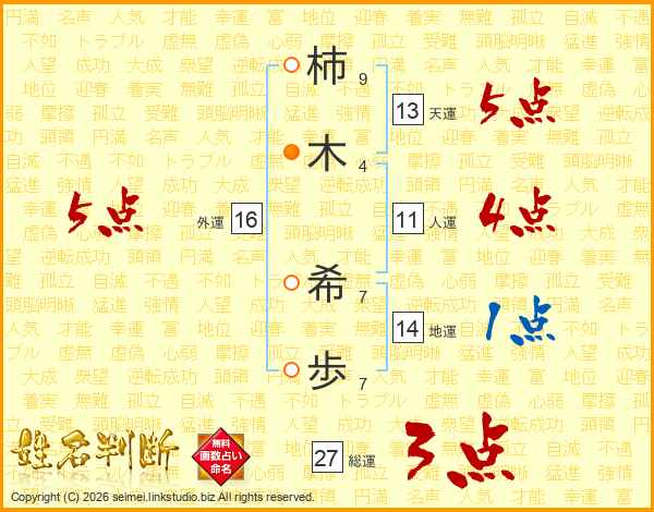 生活面を象徴する運勢です。外部から受ける影響力を表し、結婚運、家庭運や職場、環境への順応性を表します。総運から人運を引いた画数。姓や名が1文字の場合を除く。