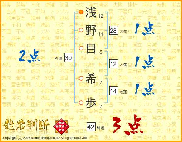 浅(12画)野(11画)目(5画) 希(7画)歩(7画)