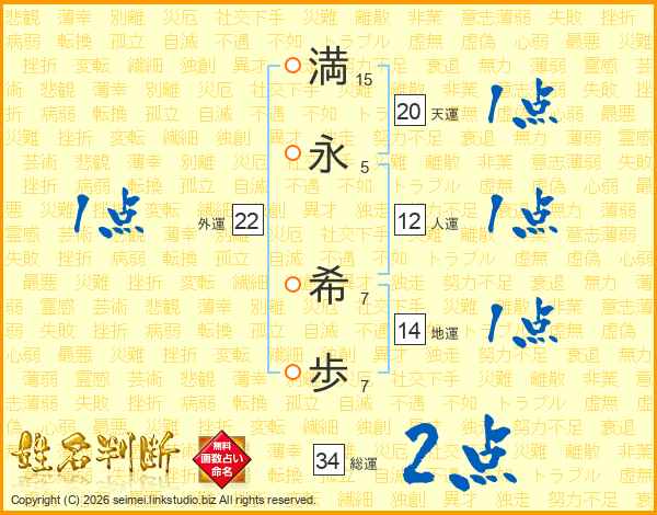 満(15画)永(5画) 希(7画)歩(7画)