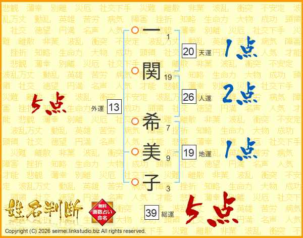 一(1画)関(19画) 希(7画)美(9画)子(3画)