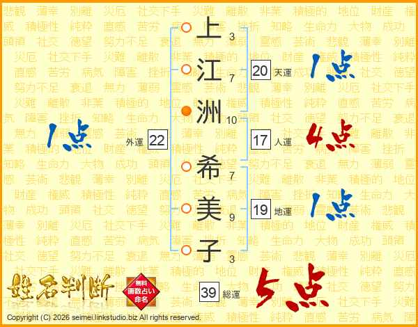 上(3画)江(7画)洲(10画) 希(7画)美(9画)子(3画)